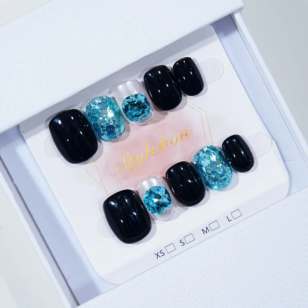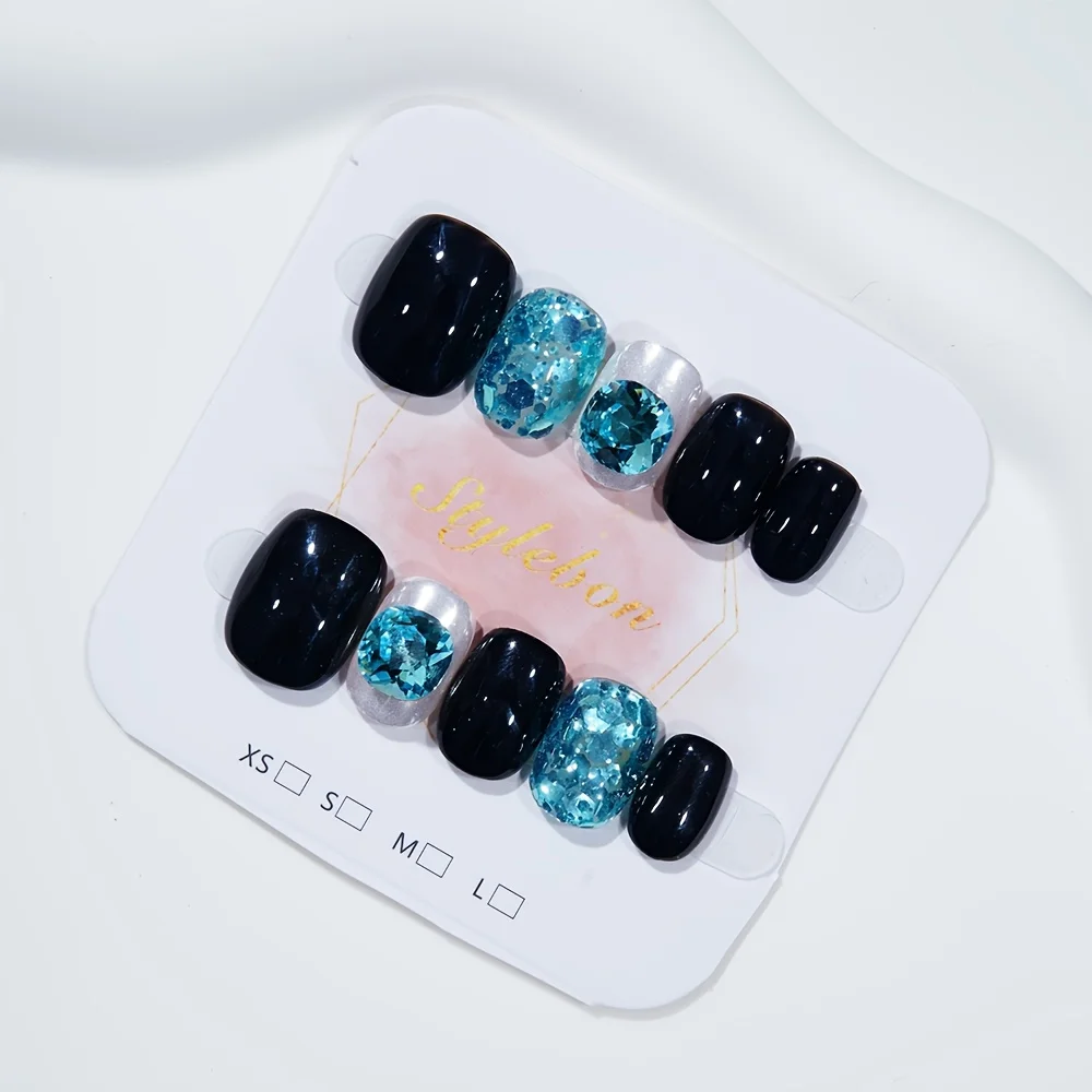 10pcs Handmade Press on Nails Black Full Blue Gradient Diamond False Nail Short Oval Detachable Wearable Nail for Women&Girls