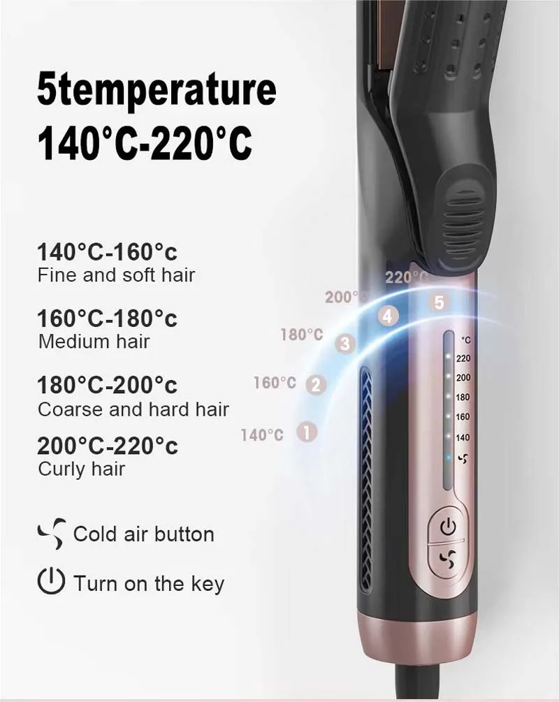 Adjustable Heat Settings: With 5 temperature settings to choose from, ranging from 140℃ to 220℃ to meet the needs of soft, medium, hard hair, you have full control over the heat level to ensure optimal results without causing damage to your hair.