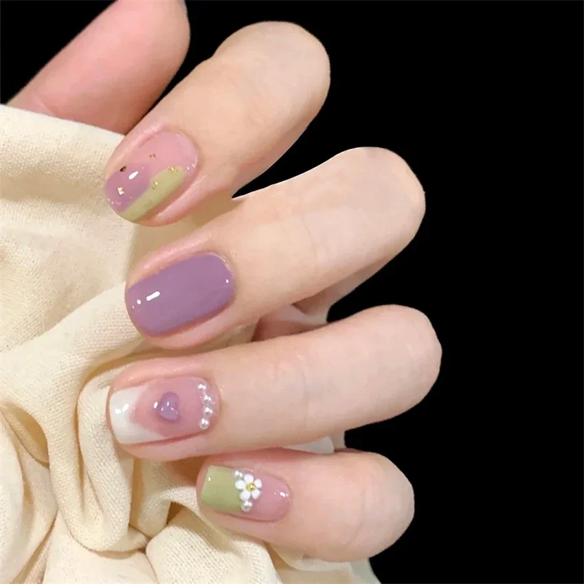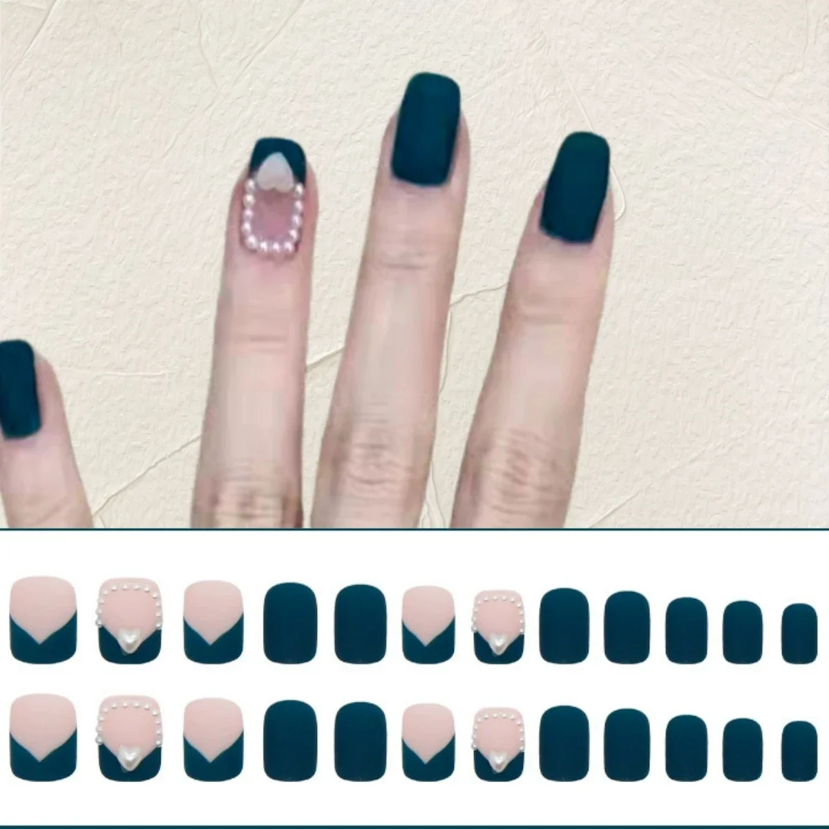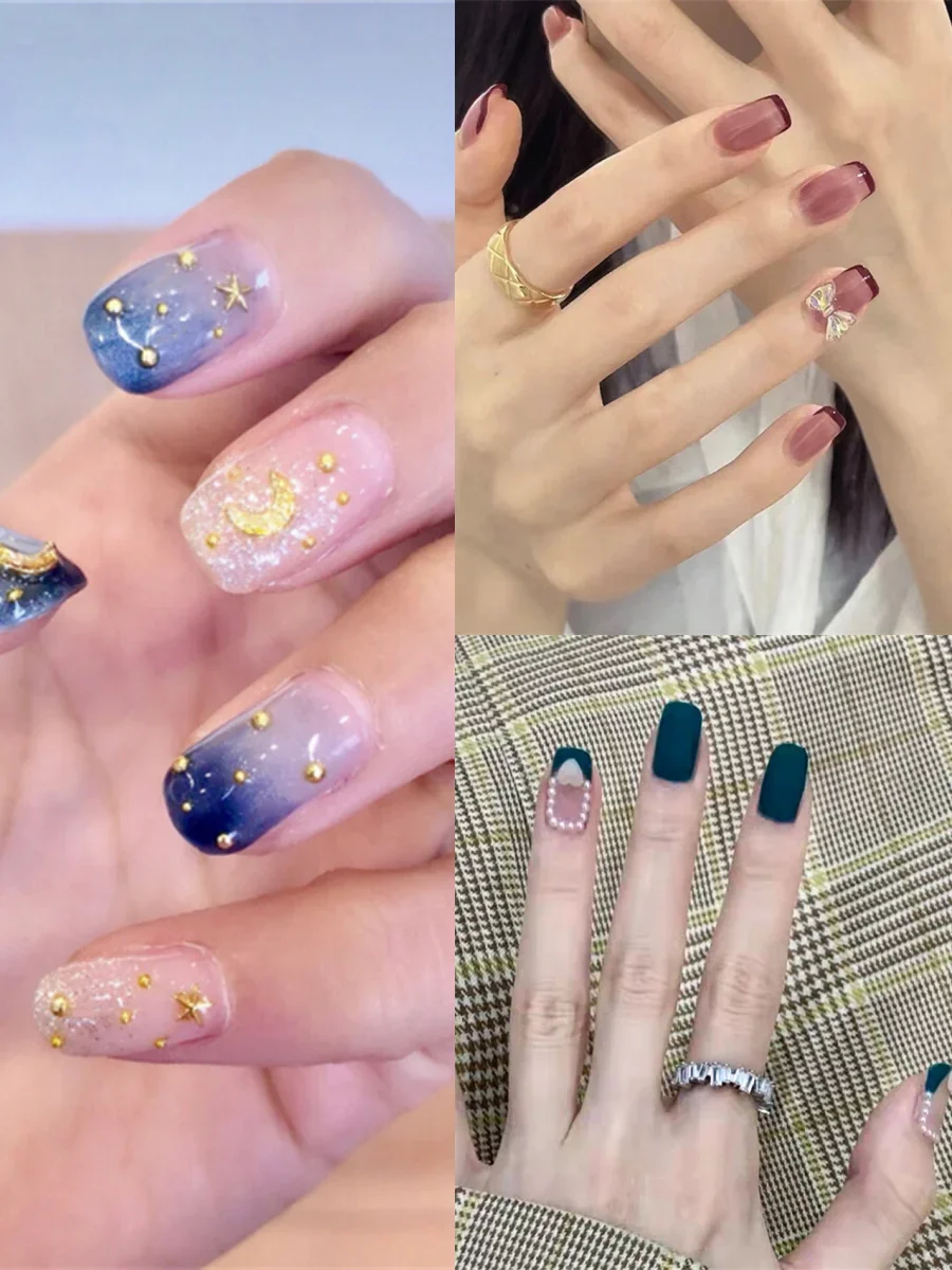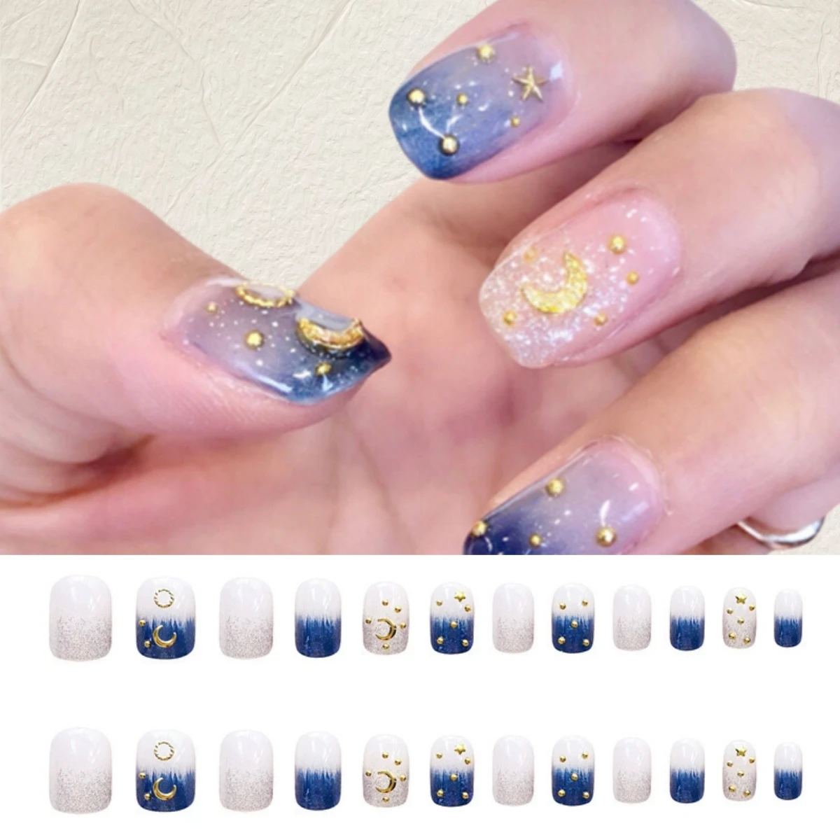 24PCS short silver blue star moon fake nail finished product full cover acrylic removable reusable waterproof press on nails art