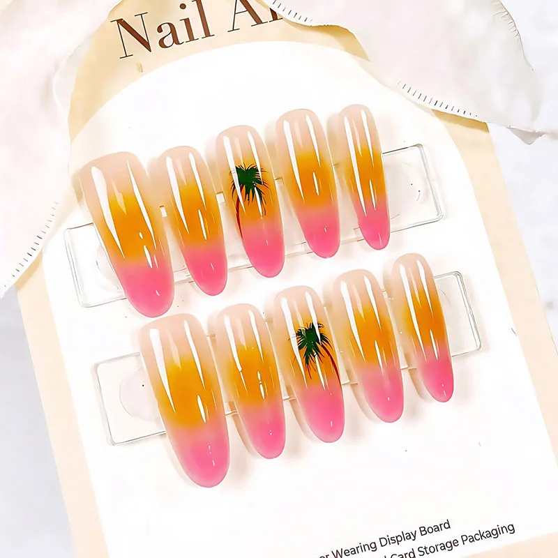24Pcs Summer Island Handmade Press on Nail Coconut Tree Hawaii Refreshing Blush False Nail for Women&Girl Wearable Nail Art