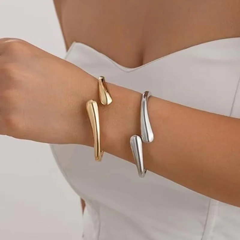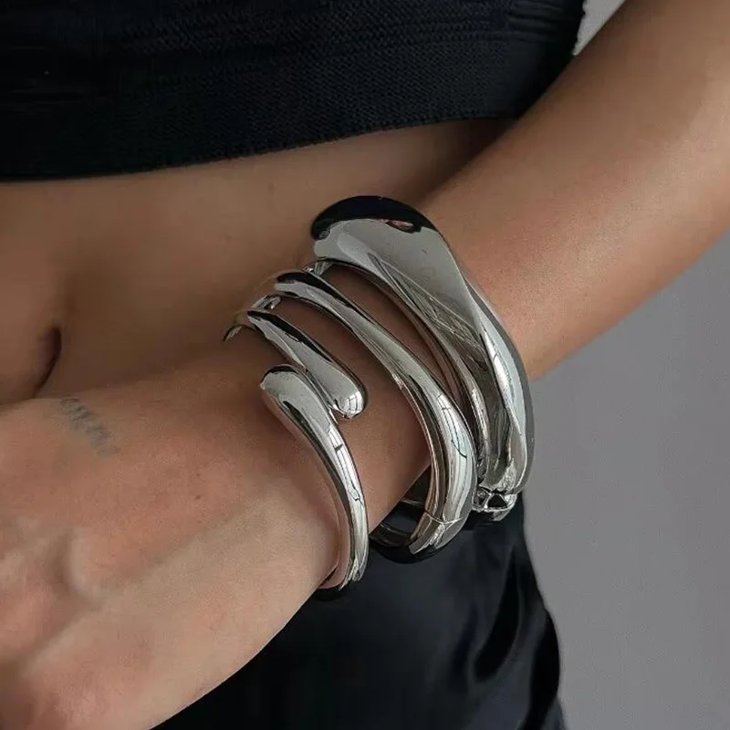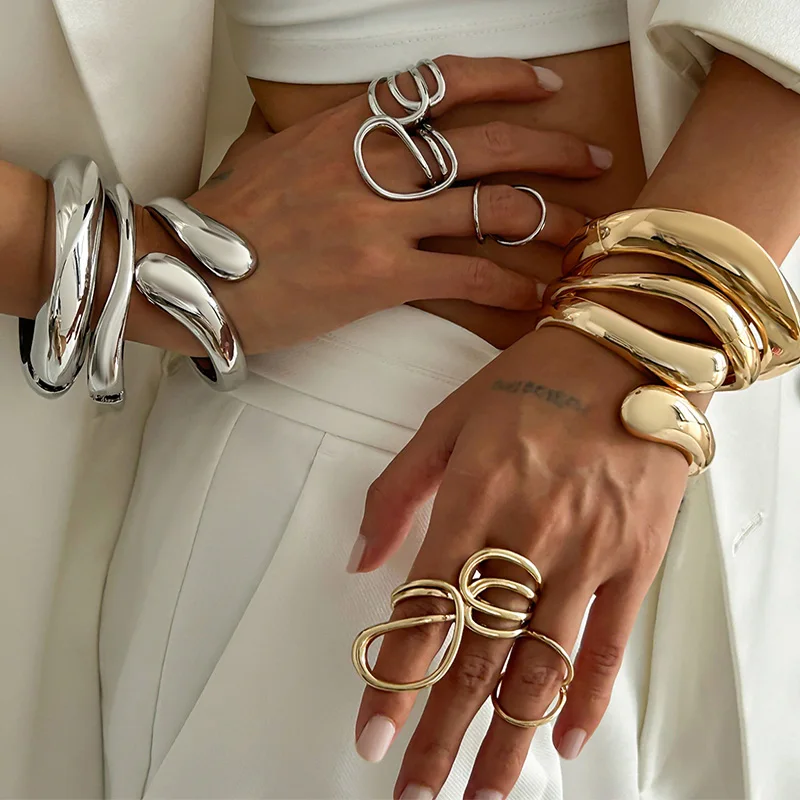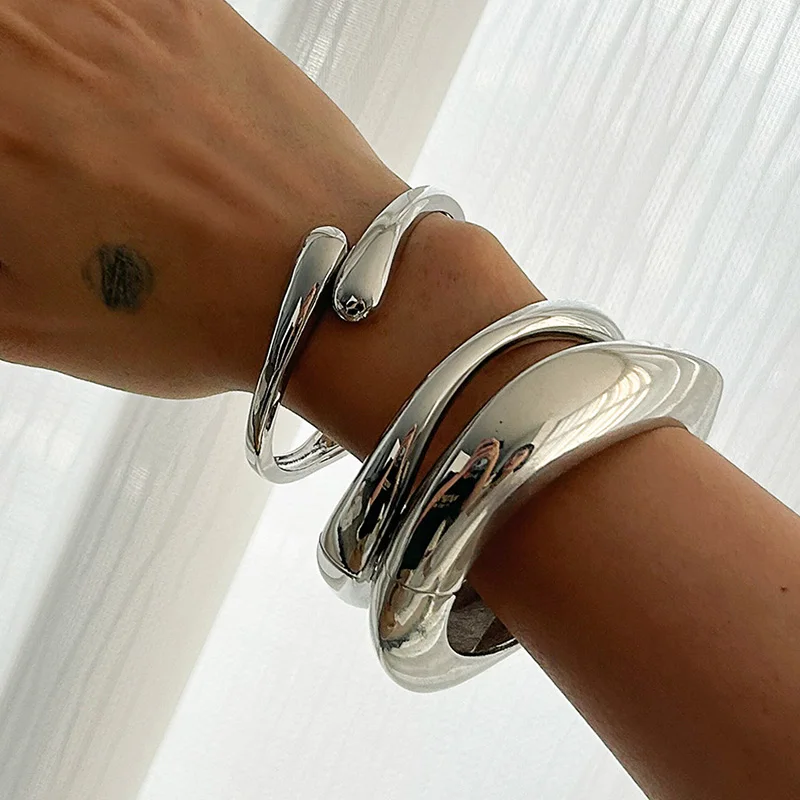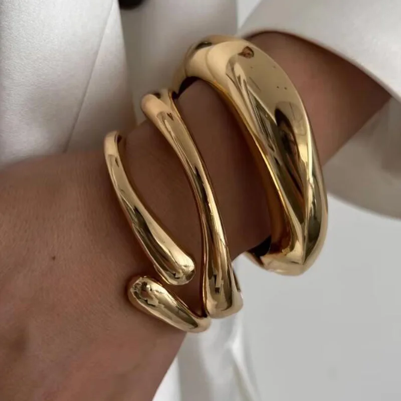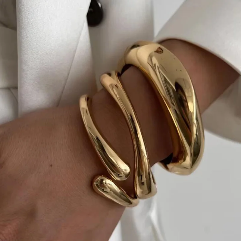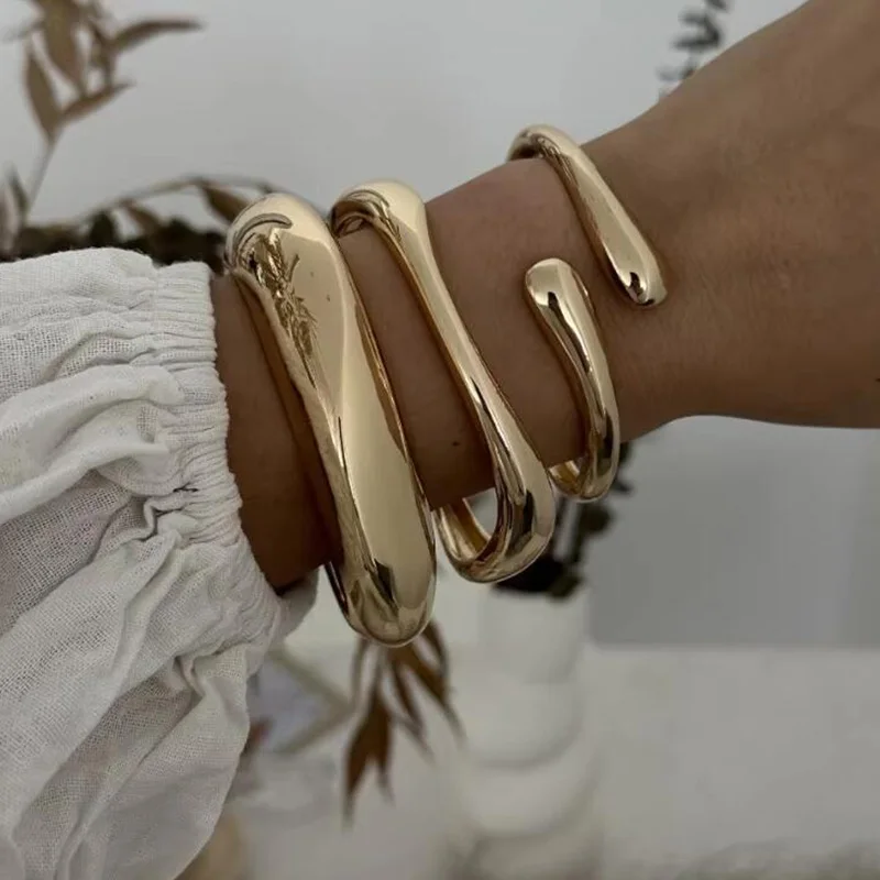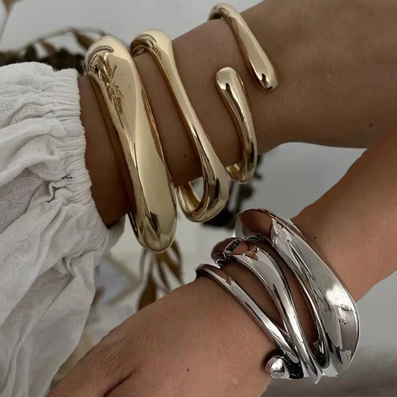 3 Styles Punk Vintage Wide Cuff Bangles Hip Hop Gold Silver Color Geometric Metal Spring Chunky Bangle Women Bracelets Jewelry