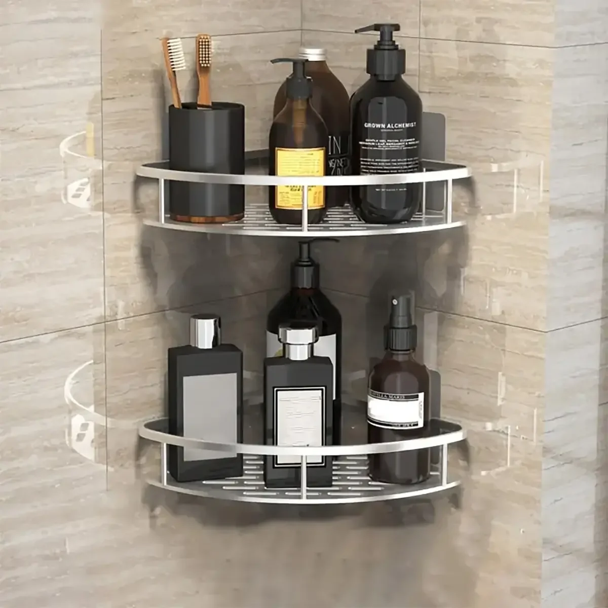 Use the corner space to store your shampoo, shower gel and other supplies