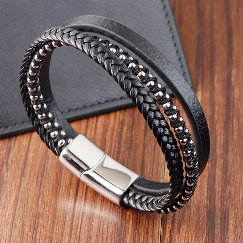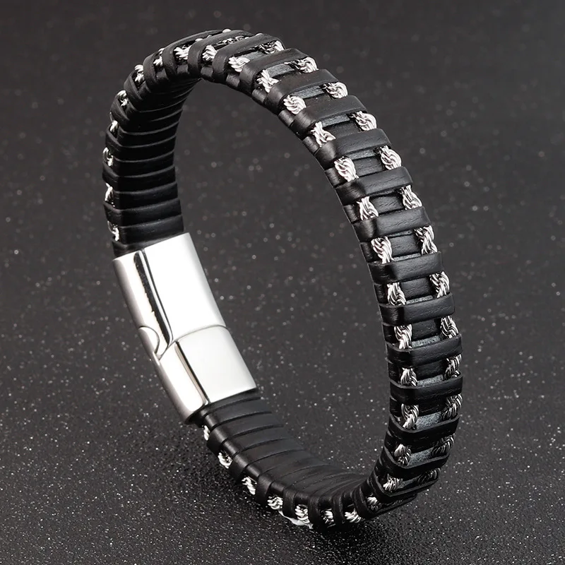 Braided Rope Woven Black Leather Men Bracelets Punk Style Stainless Steel Bangle for Friend Charm Fashion Jewelry Gifts