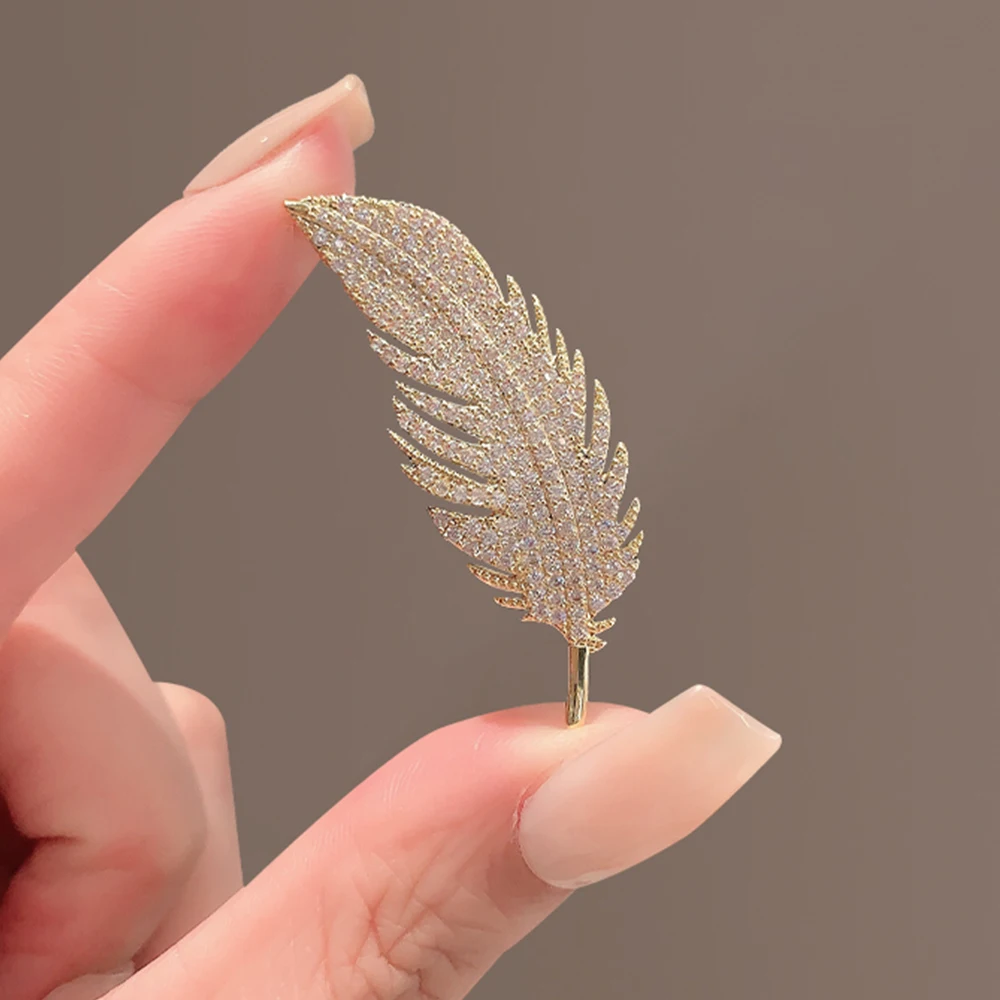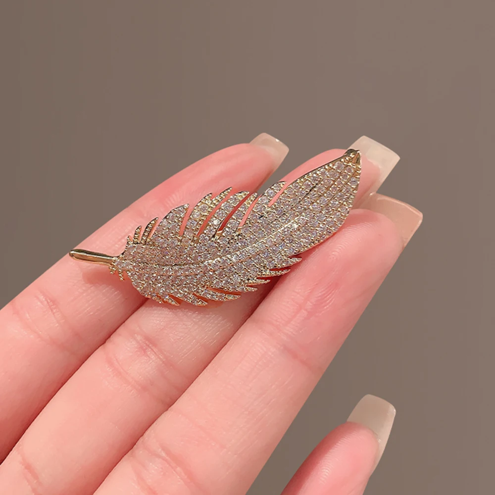 Luxury Gold Color Crystal Feather Brooches For Women Rhinestone Alloy Plant Brooch Lady Party Safety Pins Jewelry Gift