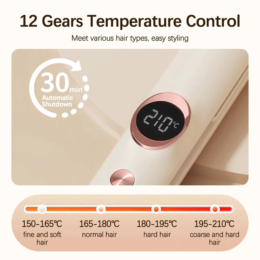1.HD temperature display with 12 heat levels (150°C-210°C) for all hair types.