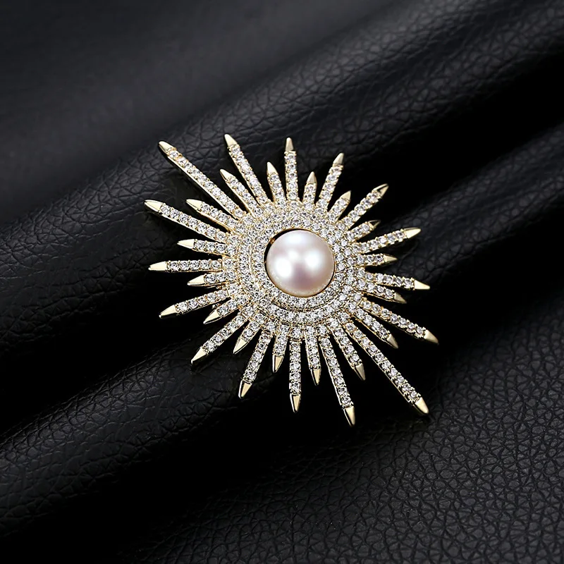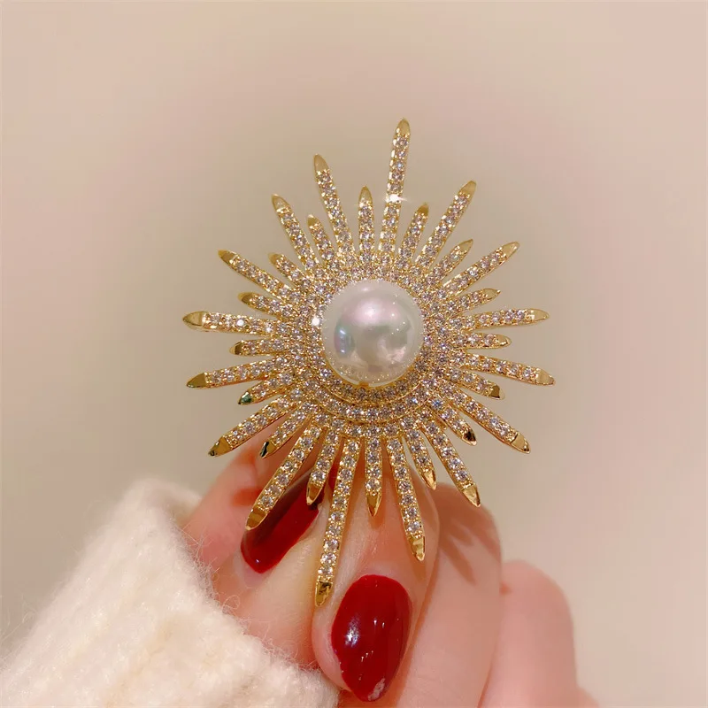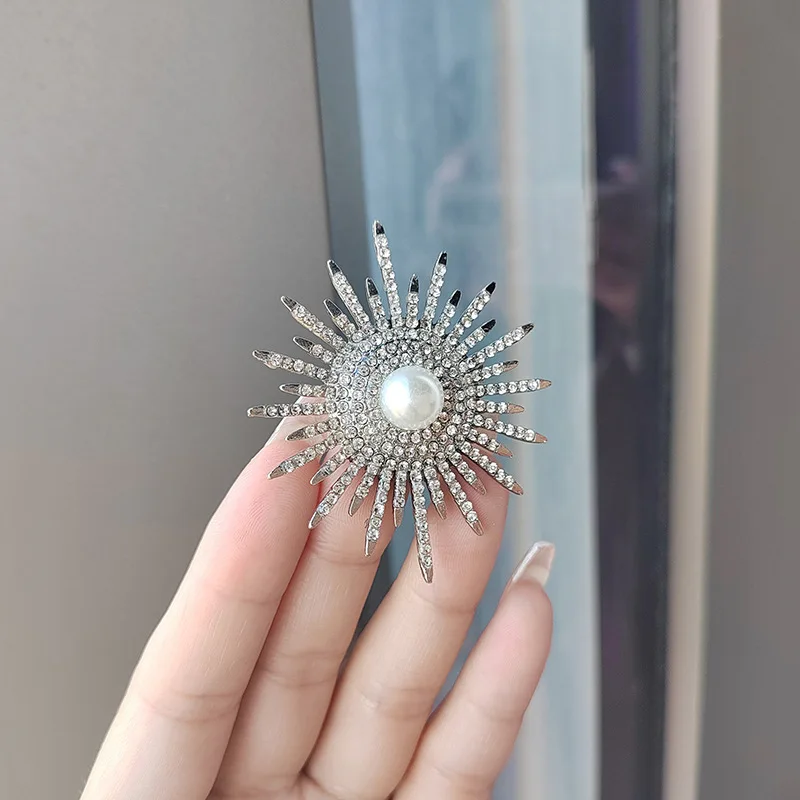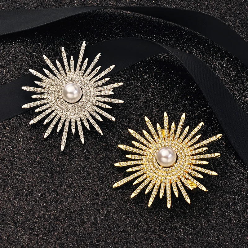 Vintage Sun Flower Brooches For Women Luxury Big Pearl Rhinestone Brooch Pins Jewelry Dress Suit Accessories Wedding Gifts