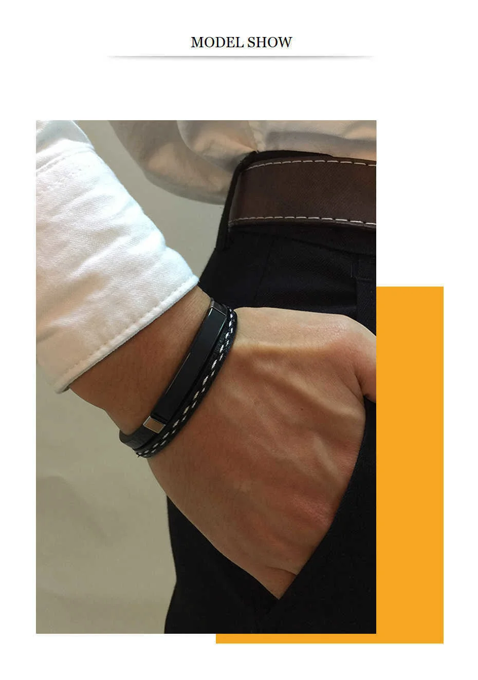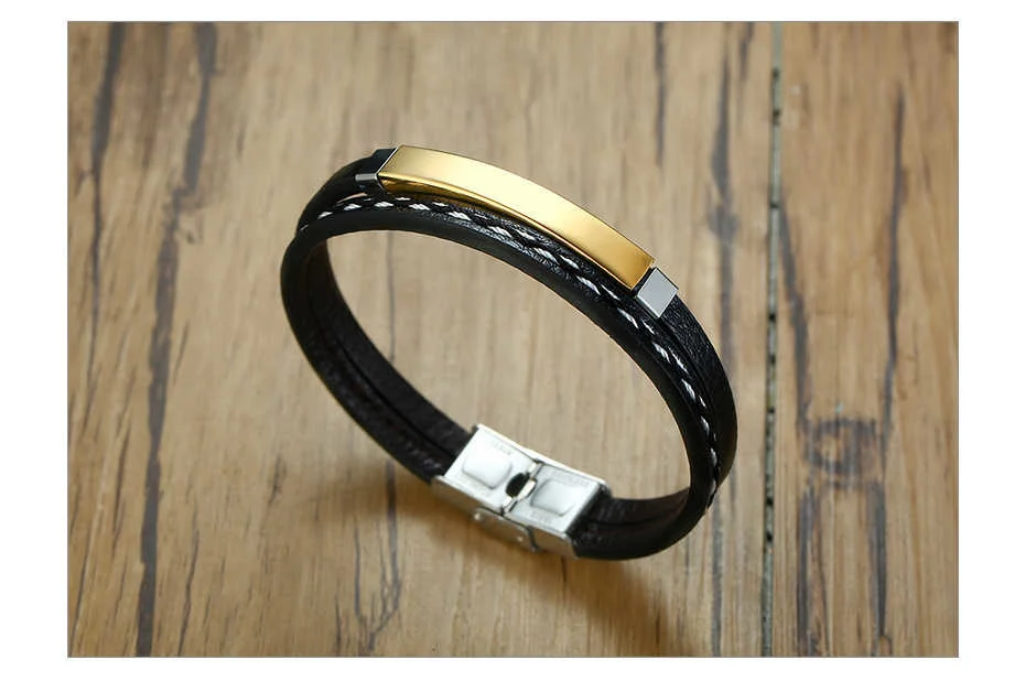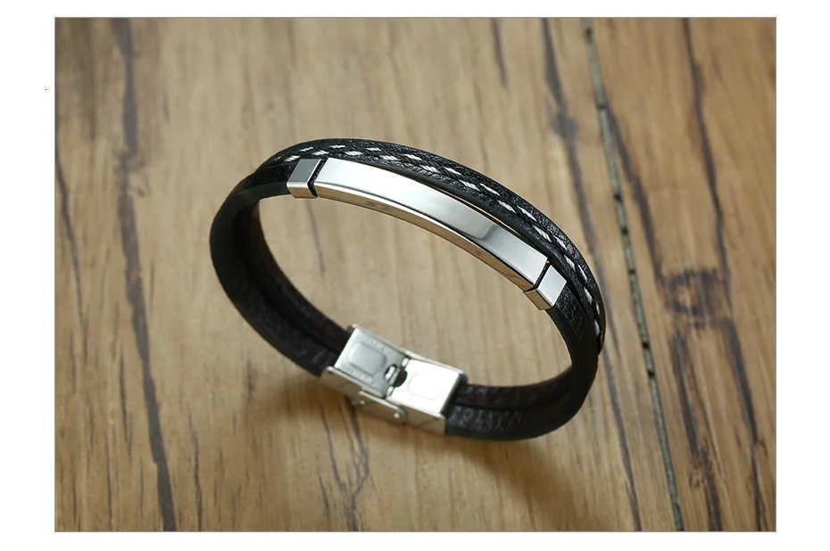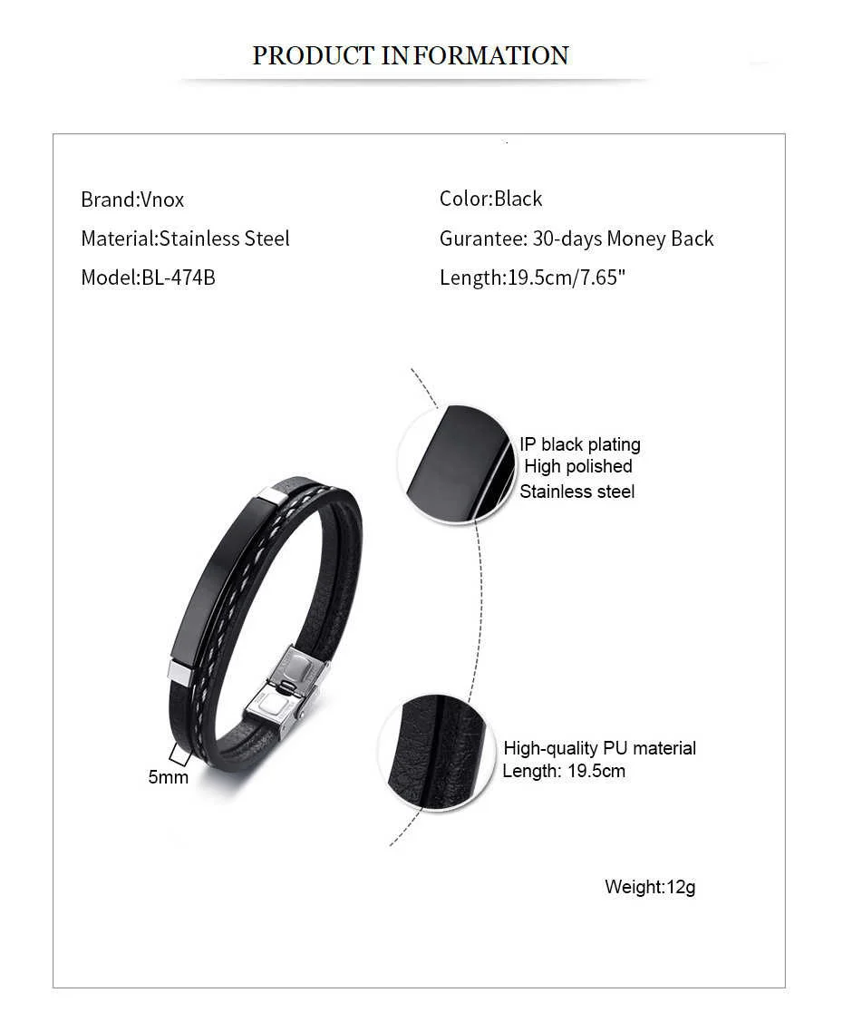 Vnox Unique Sew Lines Genuine Leather Bracelets for Men Women Stainless Steel Bar Layered Bangle Causal Pulseira