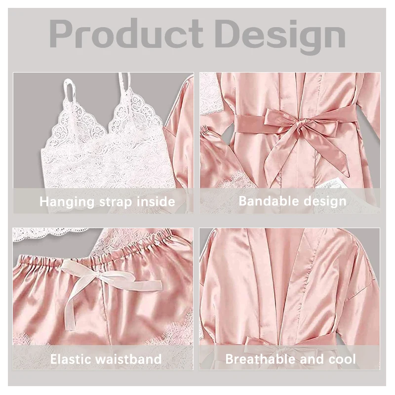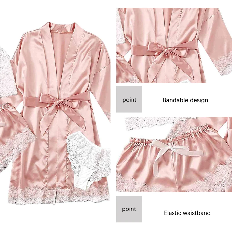 Women’s Summer Sexy Pajama Pants Set 4 Pieces Lace Satin With Silk Sleepwear Robe Fashion And Comfortable Nightwear